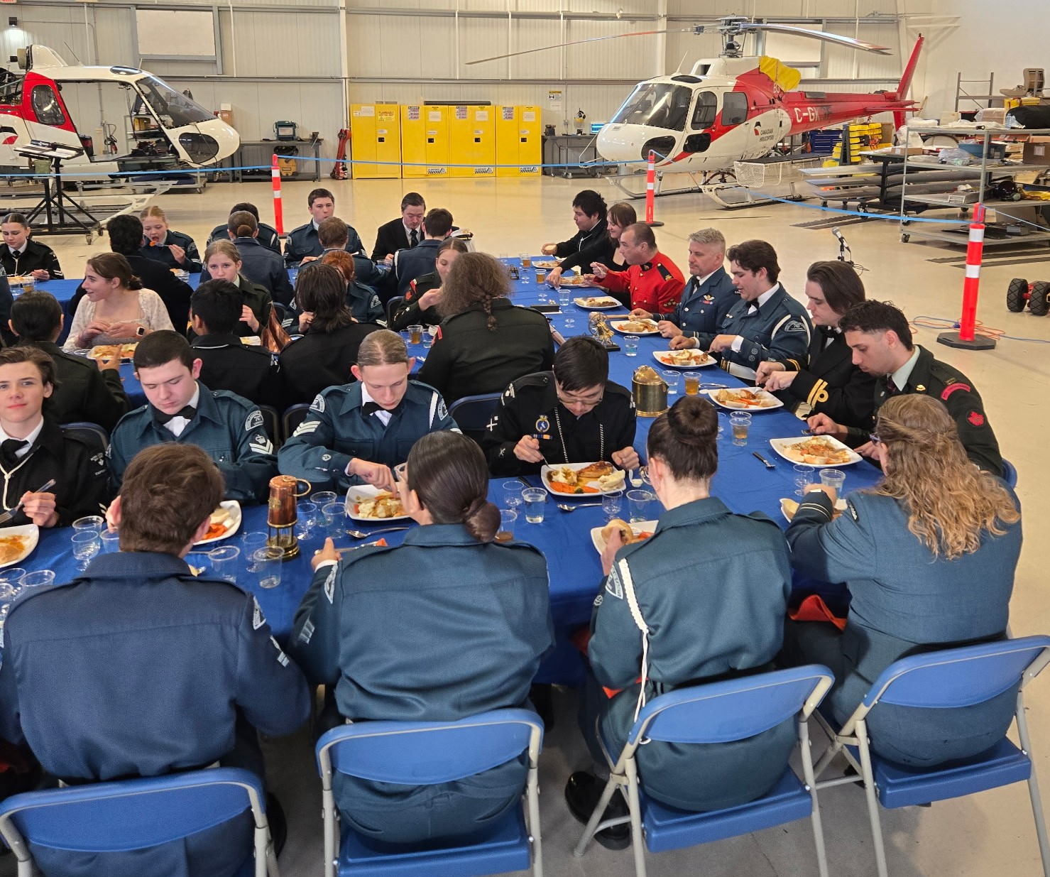 Canadian Helicopters’ Terrace base recently hosted a formal Mess Dinner for cadets from the local region. The cadets and officers in attendance were from Prince Rupert (7 Royal Canadian Sea Cadets Corps/ 7 RCSCC), Kitimat (2556 Royal Canadian Army Cadet Corps / 2556 RCACC), and Terrace (747 Royal Canadian Air Cadet Squadron / 747 RCACS). A Mess Dinner is a military gathering to enjoy a meal and a speech from a guest of honour while observing mess etiquette and military protocol. The guest of honour for this event was Staff Sergeant Michael Bourguignon, City of Terrace Detachment Commander.